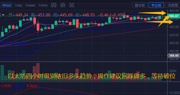 以太坊日内行情走势跟随比特币,但上行动能不强,日内上行未打破上方470阻力压制,目前稳定在467.5附近。以太坊四小时级别来看,布林带平缓向前运行,行情稳定在中上轨区域来回震荡。附图中MACD快慢线向前走平运行,红色动能柱小幅放量。四小时级别来看,行情处在拉升趋势当中,晚间操作重点关注460-470区间,破位继续看涨关注公众号:币汐柔。