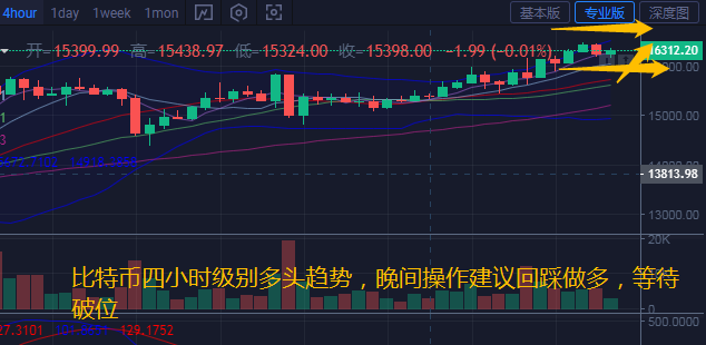 比特币今日行情冲高至16477后受阻回落,目前稳定在16255附近运行。比特币四小时级别来看,币价小幅回踩试探下方MA10支撑。布林带开口向前运行,各均线呈多头排列,下方支撑位也是不断上移。附图中MACD快慢线勾头向上在零轴上方运行,多头动能柱放量。四小时级别来看,盘面依旧多头占据优势,行情回调关注下方16000关口支撑能否支撑有效。不破晚间继续看多关注公众号:币汐柔。