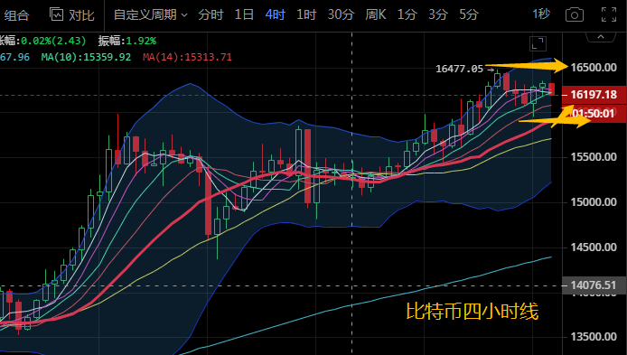 比特币昨日行情冲高至16477后受阻回落,今日凌晨行情向下插针至最低点15950后反弹,目前稳定在16210附近运行。