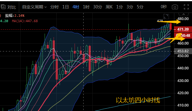 以太坊行情跟随比特币走势,行情拉升还在一路狂跌之中,目前回踩至最低点456。以太坊四小时级别来看,布林带缩口向前运行,币价跌破中轨支撑持续下行。四小时级别来看,布林带缩口运行,MA5向下勾头运行。附图中MACD快慢线死叉向下运行,红色动能柱放量,KDJ三线向下发散运行。四小级别空头情绪逐渐加重,行情关注上方465-470,下方关注455-450,顺势跟进。