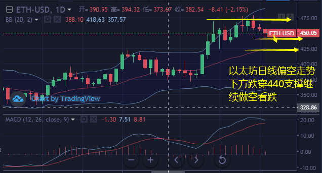 策略一:以太坊回落至448继续做空,止损4个点,目标444-442.