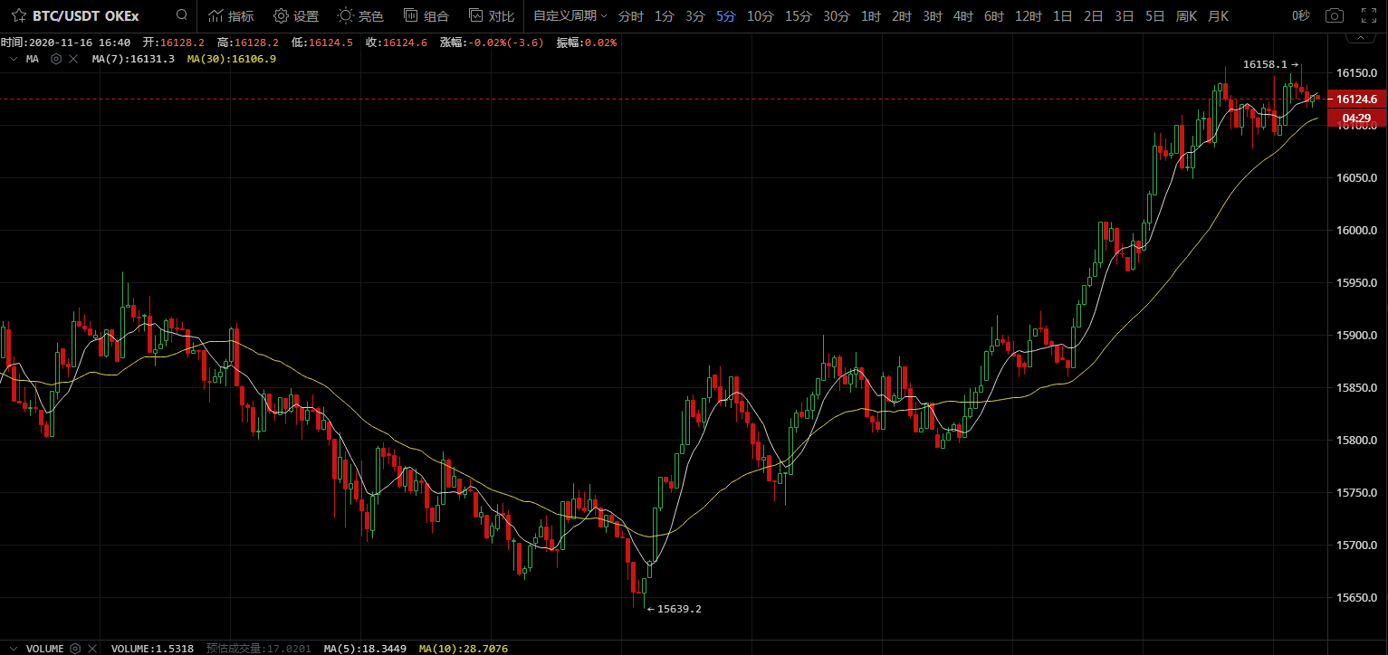 BTC突破16000后,高位连续三天调整,调整的幅度非常有限,基本围绕16000上下反复,高位调整量能越来越少,说明抛售筹码有限,多头依然占据主导,70%的概率可继续看涨,目标为依然是16100,16300美金。我十分期待本轮能创下一个历史新高。