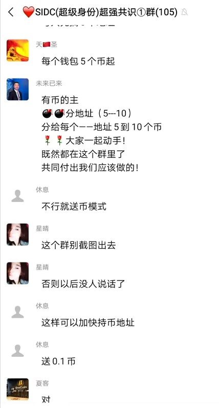 看完就明白了,这群人是真的坏,每个人控制几个地址,然后充值了代币和ETH,搞得项目非常繁荣的样子,而这一切,都是为了最后的收割罢了。此外就是吹牛了,有人给我发的截图显示,什么排名前三十的交易所想要强制上线SIDC,什么再不买就来不及了等等的话术。