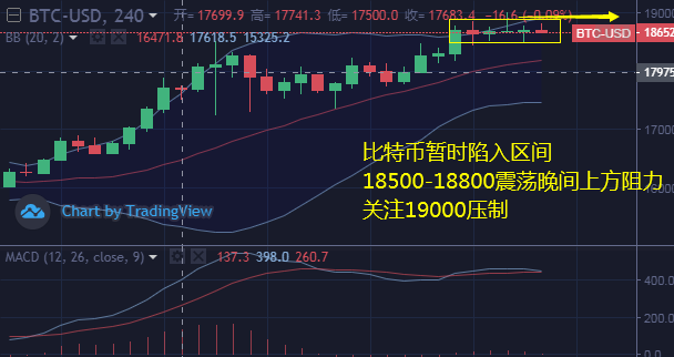比特币从十月开始一路大涨,连续两个月月线收阳,月线两个月的时候行情涨了快10000个点空间,K线运行在布林带上轨,月线前期压制点关注2017年12月阻力19875.85美元高点,所以对于后市市场很多分析师都是看好上涨目标20000美元关注公众号“币钰”。日线上来看K线运行在布林带中轨,布林带缩口上扬,日线上多头排列强势拉伸,日线上短期比特币上方阻力关注19000压制,下方支撑比特币这两个交易日下方支撑关注18500.附图MACD在零轴上方金叉运行,红色动能柱,指标弱势加强。