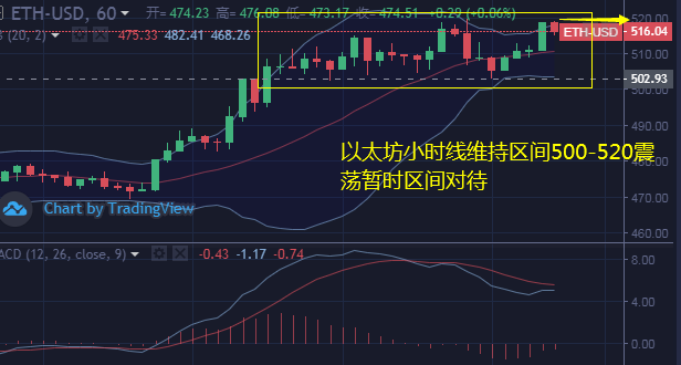 以太坊日线上没有什么技术可然就是看涨不变,日线上K线运行在布林带中轨,布林带缩口上扬涨势强势拉伸。日线上以太坊昨天涨破480-500区间压制完美涨破两年阻力位关注公众号“币钰”,日线多头蠢蠢欲动不断向上伸展。操作上日线级别肯定突破500后日线短期下方支撑关注500,不破继续看涨上行趋势不变。