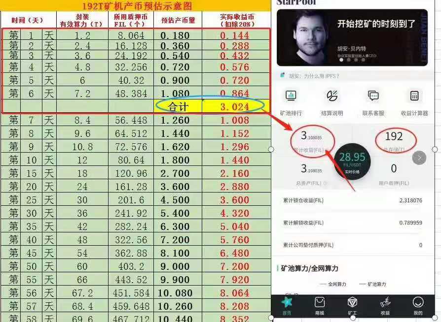 现在fil的当前价格为:190,那么18.43*190=3502RMB,也就是说一台192T的整机在封装满有效算力的情况下,日产量是3502元.某星192T矿机价格为195000,再加上第一年矿机托管费15000,成本就是195000+15000=210000.那么210000除以3502=59.965天,一个月是30天,也就是说回本周期是3个月。那么再加上前期封装有效算力的时间,差不多就是5个月左右,那么5个月之后的每一天的产量就是你纯挖的收益!那么1年就是365*3502=1278230元,由于24小时产fil量是个变量,所以我们保守收益应该在120万左右!这就是真实