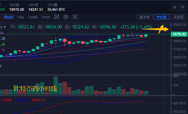 比特币早间触及高点18970后受阻回落,晚间行情持续拉升,目前已经突破18800关口,目前稳定在18780附近拉升。比特币四小时线币价上行触及上轨附近运行,各均线呈多头排列,附图中MACD快慢线粘合向前运行。四小时级别多头还是强势,晚间操作回踩做多为主,短空为辅。汐柔建议关注下方18600支撑,上方阻力看19000,若晚间行情突破并企稳19000,那么距离20000关口更进一步了关注公众号:币汐柔!