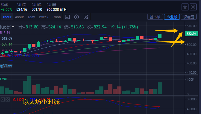 以太坊晚间行情多头强势来袭,晚间冲破520阻力关口,最高点触及524,目前小幅回落。小时线级别,行情持续拉升上行,币价一根大阳线打破上轨支撑运行在其上方,各均线微微拐头上行,附图中MACD快慢线有金叉趋势向前运行。晚间小时线级别以太坊还是看涨,关注上方阻力530,下方支撑510,汐柔建议晚间操作低多为主,短空为辅关注公众号:币汐柔。