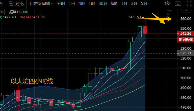 以太坊四小时线来看,布林带张口向前运行,币价沿上轨附近运行,各均线呈多头排列。附图中MACD快慢线向上拐头运行,多头红能柱放量,KDJ有向下发散的迹象。四小时级别短期有回踩的趋势,关注上方561的压力位置,下方530的支撑位置,区间段内高空低多关注公众号:币汐柔。