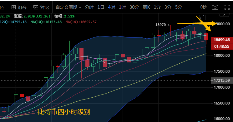 比特币四小时线来看,币价持续回踩试探下方中轨支撑,MA5下穿MA10有形成死叉的趋势,附图中MACD死叉向前运行,空头能量柱持续放量,四小时级别行情空军来袭,空头情绪越发浓重,日内关注下方18000支撑是否有效,上方关注19000阻力,操作建议高空低多,破位顺势操作。