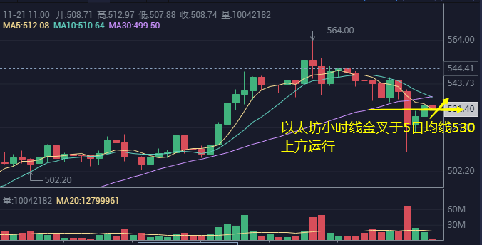 以太坊四小时线来看晚间最低触及下方低点511美元,晚间以太坊下跌没有跌穿中轨延续下跌,K线运行在布林带中轨,布林带缩口上扬,K线触底后再次反弹拉伸于昨天压制点520企稳破位上涨关注公众号“币钰”。小时线收线上来看连续收取两根阳线,K线运行在布林带中轨下方,以太坊晚间再次企稳530支撑上行,布林带缩口上扬。在韩老师写行情的时候以太坊企稳五日均线530支撑,操作上午夜以太坊依托530支撑做多,上方第一压制关注540突破上看550.