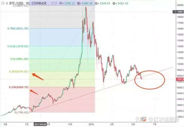 历史数据:根据15年到17年末的比特币每次超过30%涨幅后的回调统计, 在11次符合标准的回调里,有9次价格回撤到0.382-0.236的区域。