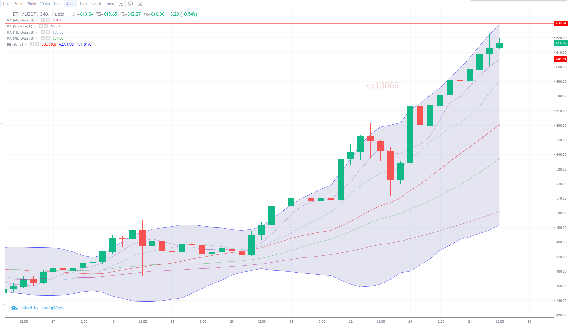 四小时线来看,布林带继续呈现开口向上姿态,价格虽短期有回调,但是整体支撑还在不断上移,各均线呈现上攻态势,K线早间已收3连阳,价格日内还会继续测试上轨630一线压力。技术上来看,MACD形成金叉后持续不断的向上发散,KDJ和RSI指标都进入了超买的区域。币价的加速度上涨还在继续,目前正处于冲刺阶段,其实这个时候就不要考虑什么压力位了,只要涨势能继续保持,高点还会继续刷新。短期操作还是回调多单为主,关注上方630位置附近的压制和下方610位置附近的支撑。