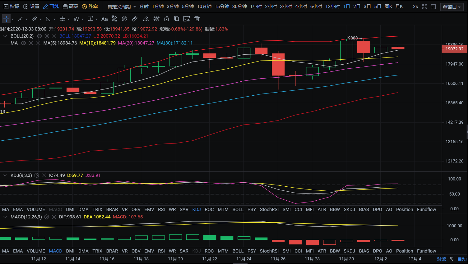 走势图上来看,日线级别价格此前的大跌回踩布林带中轨附近后强势反弹,目前不仅将跌幅收回,前天更是刷新历史高点。随后价格开始剧烈震荡,但是最终仍是回到19000上方运行。5日均线不断上行,目前支撑价格于18966位置。附图指标上,快慢线目前粘合走平于0轴上方高位开始发散。