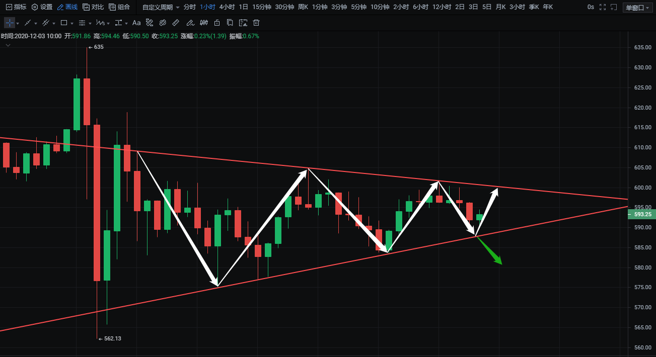 以太坊小时级别来看价格联动比特币破位后急速下跌反弹,目前行情维持窄幅震荡,继续关注破位情况。布林带缩口运行,各均线缠绕运行。重点关注600关口。幅图指标MACD快慢线于0轴附近粘合运行。KDJ三线向下发散。RSI指标三线拐头向上运行,上方压力位600,下方支撑位588,操作上高空低多为主。