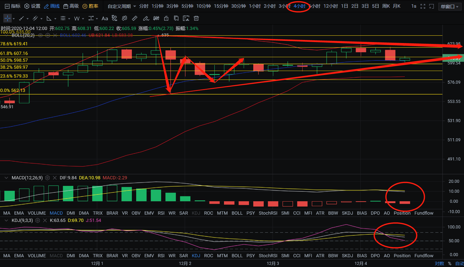 目前以太的空头趋势仍然存在,在四小时我们可以看到,这两天持续上攻下踩,效果却不太理想,可见上方压力620,下方支撑586还是比较强烈的,在这个区间内维持高抛低吸也是获利甚佳,MACD快慢线金叉下行,空头能量柱持续放量,KDJ三线金叉下行,今日附图指标走势平淡无奇,接下来亿和还是比较看好盘整,在区间内维持思路继续操作,等待三角区关键置破位,我们再行单边操作方法,眼下抓住可拿的利润。