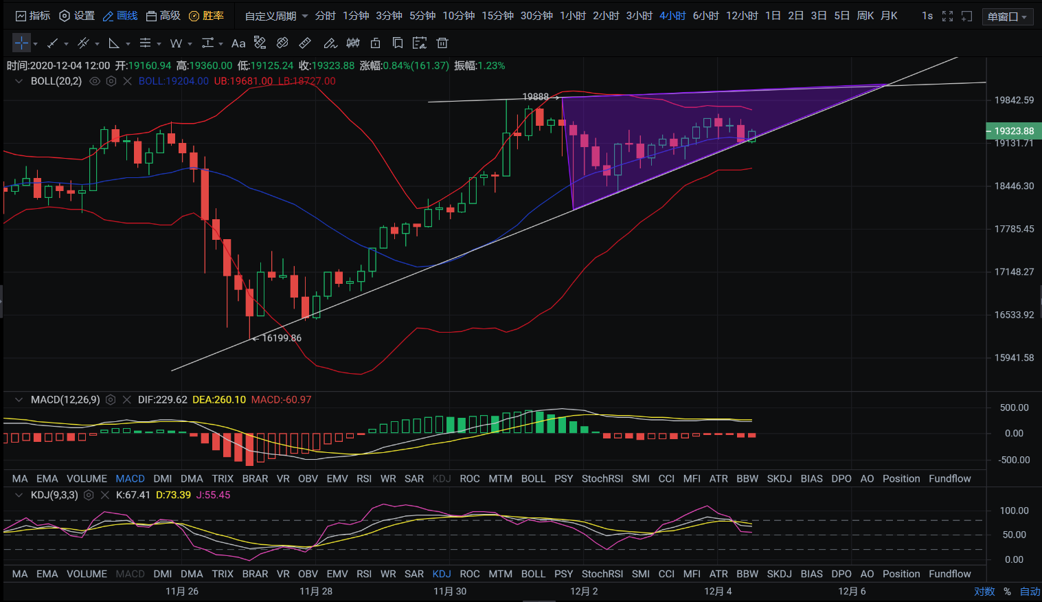 灰度今天又是持续增持,大饼横盘已久,日线来看最低点来到18866附近,上方压力、下方支撑强烈,给我们呈现震荡盘整趋势。目前币价来到19320附近运行。短线上来看布林带开始缩口,K线目前来到中轨线附近运行,而后市的发展仍然在三角区间内运行。
