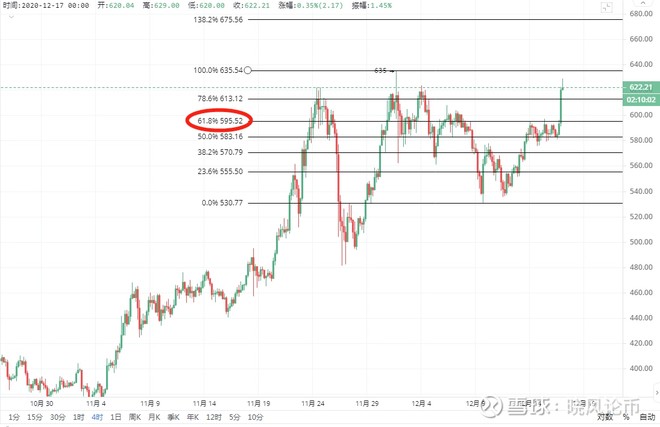 以太坊并没有跟上大饼的暴涨走势,只是在触及628一线后便停止了上行,并没有突破年最高点635一线,不过不排除后续出现补涨的情况,所以操作上不建议抄顶做空。