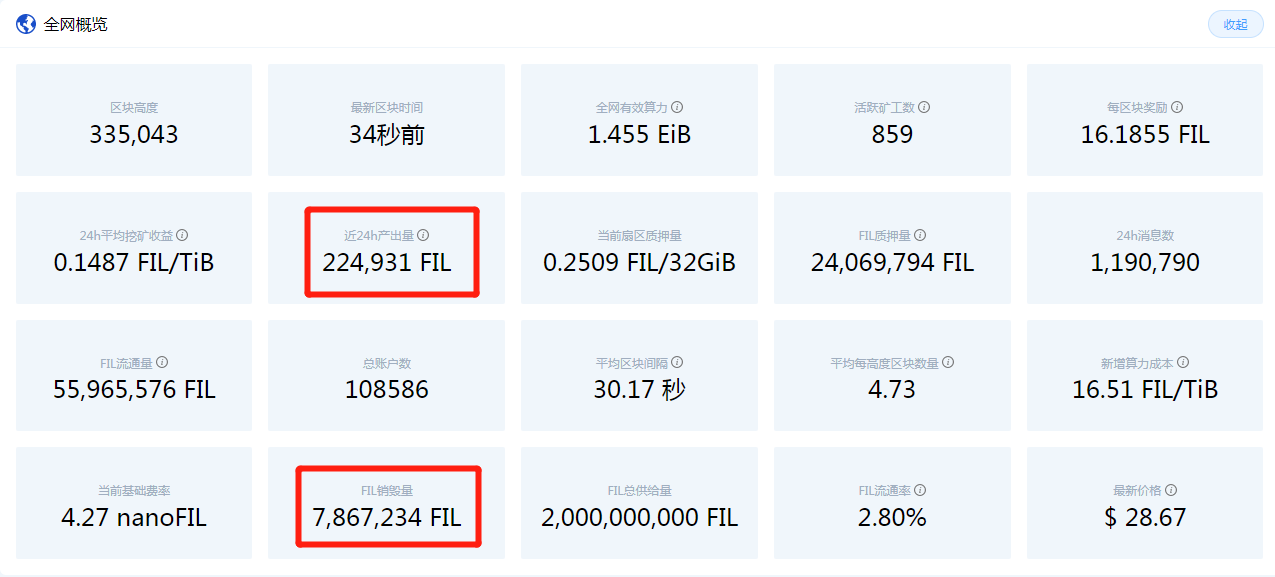 在浏览器上我们可以实时看得到Filecoin全网情况,24小时全网产出224931枚FIL,其中25%直接释放,即56233FIL直接释放,加上线性释放部分,全网一天的释放量不足10万;而目前FIL销毁量已经高达7866724FIL,由于近期gas不断攀升,这将导致销毁量高于释放量,也就是说矿工幸苦的挖了一天的矿,却有可能入不敷出。