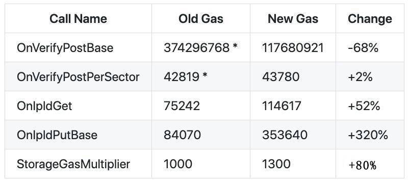 大家可以直接看到的就是,PoSt的验证费用大大降低了。那么这对WdPoSt的消耗产生了积极的影响,更省钱了。但是,对存储相关的操作费哟哦那个又都升高了。这是因为当网络数据越来越多,存储的消耗成本也越来越高,这之前对存储的消耗哦估计不足,所以进行调整。这个调整后,大家看到的情况就是PreCommitSector和ProveCommitSector消息费用不降反升了。尤其是对于大矿工而言,增加算力时对存储的访问量更大,其消息消耗的燃料费更高。