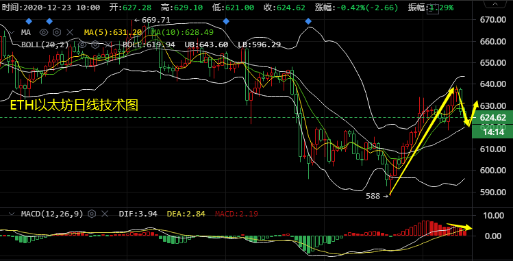 ETH(以太坊:以太坊受大饼的带动,行情反转再反转,二度下破600美元关口,以为是回调的开始,没想到只是诱空。在强势突破620美元关口之后及时转换了交易思路倾向看多,有时候行情就是这样,肆意的变盘让你措手不及。隔夜说好的以太坊看向635美元一带,早上不经意间发现最高触及638美元一带,但多头未能持稳,转而向下失守630美元关口并再度测试620美元关口,该位置恰好是小时线的BOLL中轨。今日白盘重点关注620-632美元区间,操作上保持主多辅空思路进行。