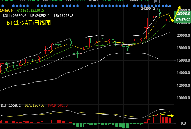 日线上看BTC在高位盘整已有多个交易日,上方三度冲击24000美元关口后承压回落,下方亦是三度下探23000美元关口止跌反弹,两大关口的支阻力都比较强势,导致短线的涨跌都没有延续性。技术图上看BOLL依旧呈开口状态,上行空间逐渐随着行情的调整延伸,大涨未能守住涨势,高位盘整的时间越久回落的概率就越大,目前来看行情还是偏向多头运行。短线MA5/MA10持续金叉分别于23400、22400美元一带给予支撑,而上方24000美元关口依然是我们关注的阻力位,一旦突破持稳则必然刷新高。小时线上看比特币上轨和下轨都被插针贯穿,短线行情来回切换,但依旧运行在上行通道之中。短周期各大技术指标缓和运行,附图MACD动能缩量,预计比特币将保持震荡上行走势。对于午夜的行情而言,谈老师仍是看好多头趋势,虽然短线多空随意转换,但只要币价持稳在23000美元之上,多头还是占据优势的,回调顺势做多仍是我们交易的主思路。若对技术行情以及消息面解读把握不定或者持有套单的朋友皆可与谈老师进行探讨。订阅公众号;币圈散户联盟。