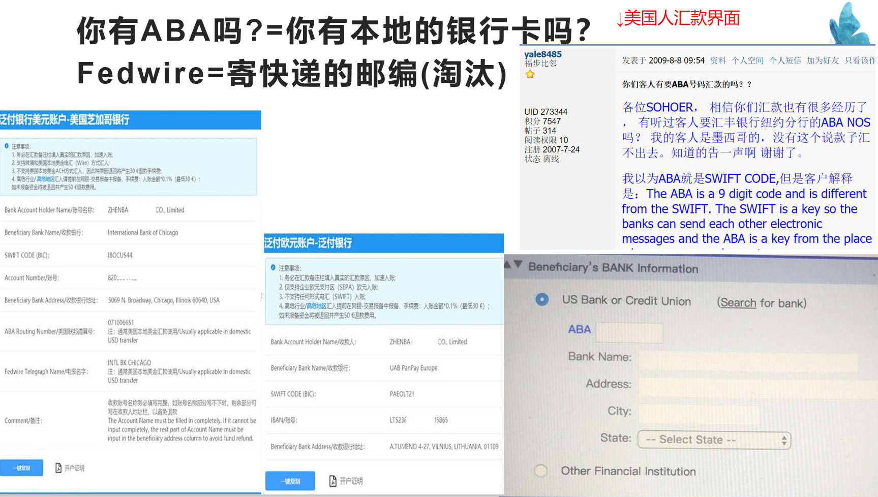 我问各位一个问题,假如你很少做进口生意,今年你从韩国买一批化妆品,一切都谈好了,最后到了付款阶段了,你想怎么付?你会怎么问?最好对方有微信收款,因为付款人首先考虑的是自己方便不方便对吧?你一定会问他:你有大陆的银行卡或者微信支付吗?那以此类推,假如今天老美从你这里买鼠标,一切都谈好了,到了付款的阶段的,老美一定会问:你有美国的银行卡或者可以付信用卡吗?我翻译过来就是:你有IBAN吗?你有ABA routing Number吗?你有SORT吗?一般美国银行或者有通过美国合作 银行打款都可能会问你所要ABA.