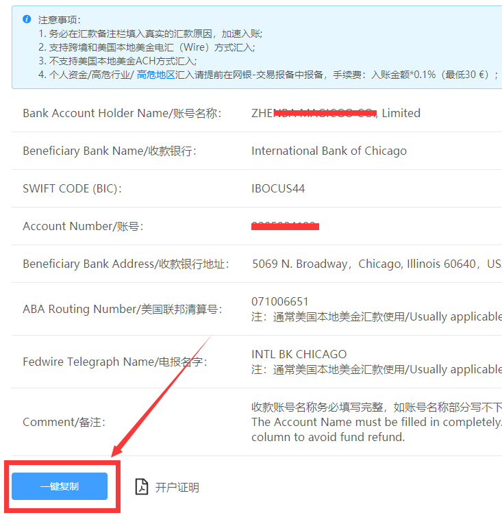 泛付账户里面一共有好几个账号,比如 IBAN/SWIFT/ABA Routing Number/Fedwire Telegraph还多了一个ABA美国联邦清算号和电报名字,理解很简单,比如ABA和IBAN就是美国和欧洲的国内转账账号,而FEDWIRE则理解成邮政编码,一般地方不用了,但是老的银行可能还会需要!
