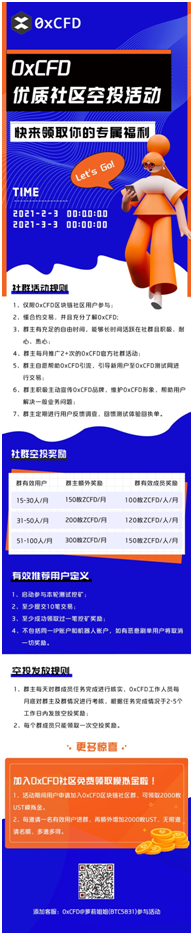 亲爱的用户, 0xCFD将于2月1日00:00开启优质社区空投激励活动啦!
