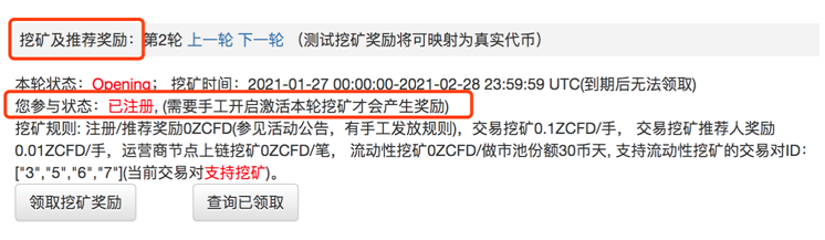 交易前,必须点击页面“挖矿及推荐奖励”中的“开启挖矿”,若不开启则交易无效。