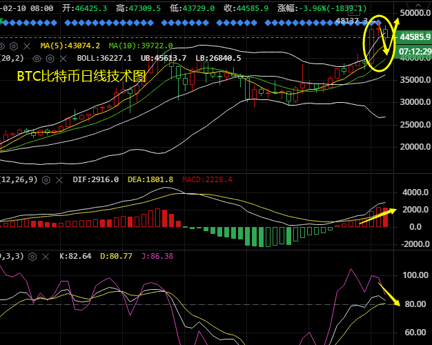 日线上看比特币在大涨收十字星之后,今日收阴出现回落,BOLL呈开口状态,币价交投于BOLL上轨附近,短期均线MA5/MA10交金叉分别于43200、40000美元一带给予支撑,上方则需关注日内高位于47200美元一带阻力。短周期KDJ技术指标缓和向下,附图MACD上行动能放量,预计比特币将保持高位调整。四小时上看比特币在冲破48000美元关口之后多头放缓,在一波横盘之后,一根大阴线直接向下跌破两大均线,均线MA5/MA10交死叉分别于46000、45600美元一带形成压制,而下方则重点关注BOLL中轨于43600美元一带支撑,一旦下破的话币价将继续下探。短周期KDJ技术指标缓和向下,附图MACD下行动能放量,预计比特币短线伴有回调的迹象。