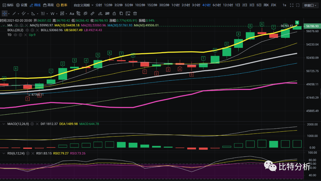 今日行情讲解:BTC上涨动能充足,日线币价连续四连阳,截止写文,买盘量达到了72.6%指标MACD多头方向还在持续放量,四小时价格突破重重压制,短期上轨处于压制状态,注意突破新高后的小幅度回调,建议顺趋势多单为主,空单注意把握短线收益。