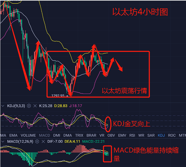 而1小时行情价格走势图来看,以太坊连续收取5连阳,而dif指标快慢线交叉向上带动macd红色能量连续3次增量放量并且kdj指标保持高位交叉向上的趋势,在看看3小时布林带k线图以太坊从布林带下轨价格附近形成支撑后开始反弹并且kdj指标在底部0轴形成金叉向上的趋势而macd绿色下跌能量开始缩量,那么以太坊关注1550美元的压力那么在3月6号当天以太坊的行情价格走势钱楚基的建议是关注6小时布林带中轨价格的压制,这个价格买在1560美元附近,一旦突破那么以太坊关注1600美元,如果没有突破还是继续看区间运作,整体来看3月5号以太坊一天的行情走势,走出了一次m形态趋势,并且保持在1400美元到1600美元区间,那么中轨价格的压制不破位那么高空即可。