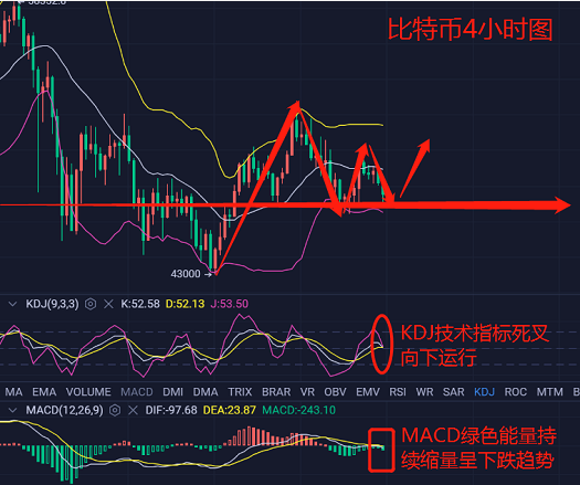 比特币从3月6号晚间18点行情开始说起,最高49100美元附近开始下跌并且连续收取6连跌而KDJ指标保持底部交叉趋势,并且DIF指标快慢线交叉向下带动MACD绿色下跌能量开始缩量,而2小时布林带行情走势图来看三线开始走平,并且连续收取8连跌,而KDJ指标死叉向下运行,并且MACD红色能量减量,而DIF指标缩量综合来看以太坊继续看下方46500美元价格支撑,毕竟6小时布林带走势图中轨下跌连续收取3连跌而下轨开始张口向下并且DIF指标快慢线交叉走平,带动MACD绿色下跌能量震荡放量,而KDJ指标保持50轴下方运行,那么比特币行情晚间至明天白天还是继续高空思路布局,看能否破位46000美元。