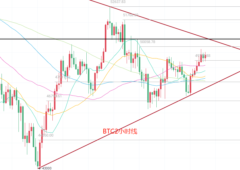 我们再看午后2小时K线的走势,KDJ向上发散疲软,K线一直处于布林带上轨下放,MACD缩量以后DIF走到了DEA上方,五日均线现在处于不规则状态,再看半小时线的走势,这个时候均线MA15走过了其他四条均线上行,KDJ向上形成黄金交叉点,我们从现价49600这个位置来看,上方参考点目标看49900-50200,下方参考点49400-49200