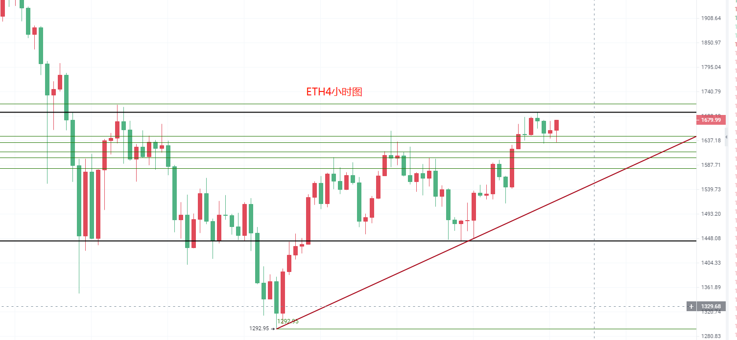 昨日以太坊从凌晨开始一直到下午四点涨幅超10%,约155美金,涨幅很大一部分原因是因为灰度对以太坊本周增持了3180枚,受到消息面刺激,和比特币影响,目前以太坊处于箱体震荡阶段,也在寻求契机突破1700关口,目前以太价格在1680处于高位箱体震荡上方关注1720-1751-1785,下放关注1664-1613-1500