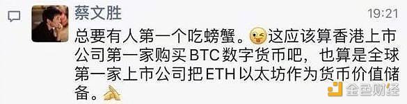 蔡文胜还表示,“总要有人第一个吃螃蟹。这应该算香港上市公司第一家购买BTC数字货币吧,也算是全球第一家上市公司把ETH以太坊作为货币价值储备。”