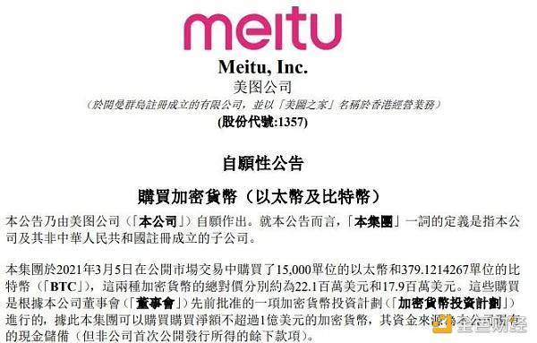 3月7日晚间,美图公司在港交所发布公告称,集团于3月5日在公开市场交易中,购买了1.5万枚以太币,以及379枚比特币(BTC),这两种加密货币的总对价分别约为2210万美元和1790万美元,合计为4000万美元(约合人民币2.60亿元)。