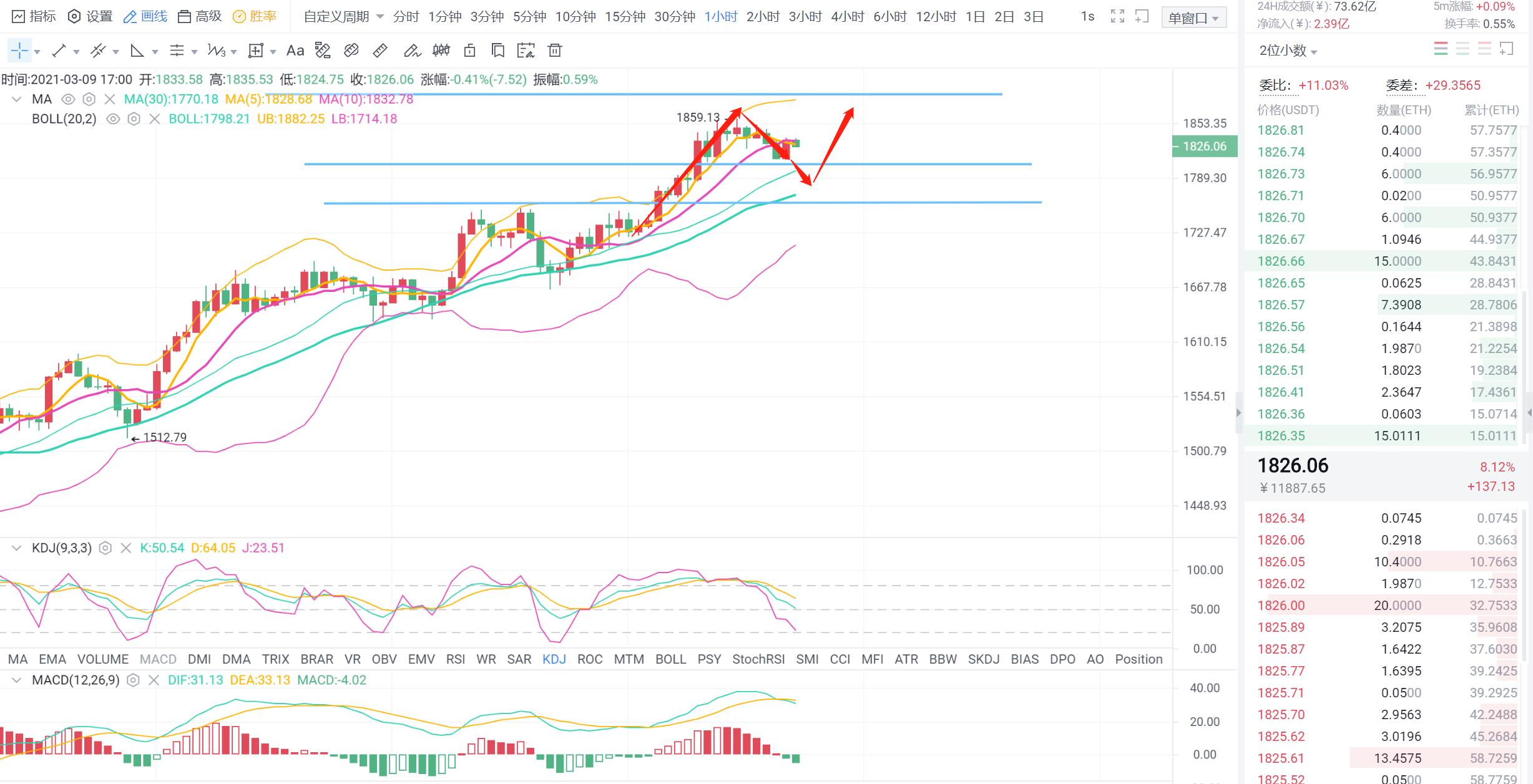 以太坊方面行情,最高触及到了1859位置,但是未能在上方进行企稳,价格承压进行回踩,在最低位到达1810之后进行反弹,目前价格运行在1828位置。整体来看以太坊的波动是更强的,多头的冲劲也是更足的,因为在昨天的文章当中已经讲过了,由于前天的快速反弹打破1700点的压制,行情直接就是由空转多目前就是多头行情,然后昨晚又进行了破位1800点。这就是一个前期上涨的延续,目前日内冲高1850之后承压回落,那么该位置就可以去作为我们当天的重点关注位,如果企稳之后追多直接上看1900点。在指标上来看以太坊和比特币没有什么大的区别,都是方方面面的多头运行,那么我们做单子现在点位追单肯定不太合适,那么把握一下进场点位下方关注多单区间,1750到1760该位置可以尝试直接进场多单,激进的朋友1780到1800这个位置可以轻仓进一些多单。上方重点关注1900点,到达之后轻仓布局的空单,操作上是以低多为主的,然后激进的朋友如果到时候行情不给回落的机会直接涨上去,那么在高位做一次空单,仓位放小。