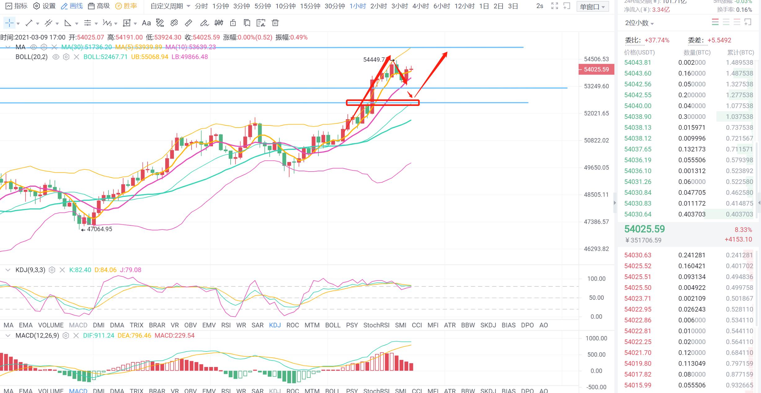 莫愁前路无知己,投资路上有知音,大家好我是玩币天王,很高兴在今天下午这个时间跟各位来复盘一下行情。不知道长期关注比特币的朋友有没有发现,昨天比特币的行情像极了年前突破52000的时候那一波,先进行回调,回调到46000附近然后进行直接的盘面拉升,破位52000最后到达54000,目前来看日线基本确认了V型的反转,2月底一轮大幅的回调之后,价格在底部形成比较强的支撑。