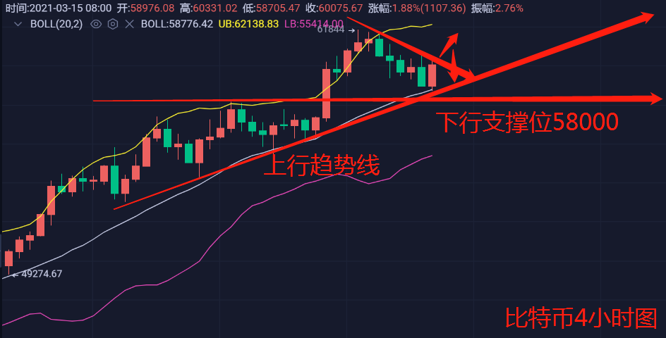 从技术面上分析行情更是偏向回调走势方向发展,但真正决定价格的往往不是技术层面,而是资金量,政.策方面,所以,比特币如果能在近期再次拉高站稳60000美元上方才能继续以震荡走高的模式向上运动,形成良性上涨,否则不然,则像目前这样在60000美元呈现虚破,那没有什么用。