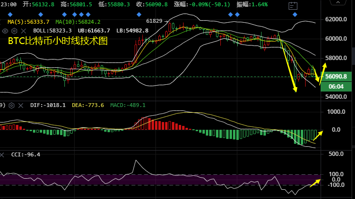比特币(BTC):亚盘震荡走高之后承压下行,欧盘加速跳水大跌超6000点,下方直指54000美元关口,美盘止跌反弹,但是整体仍是处于承压之中,短线多空来回拉锯于57000美元关口。日线上看隔日比特币收阴,今日报复性下跌下探,一度跌破MA5均线于58500美元一带支撑,下方亦是跌破MA10均线于55500美元支撑位置之后立马回升,目前币价于两大均线之中调整,而该两大均线则成为了短线支阻力(55500-58500美元区间),若是持稳在之上,短线多头仍有反攻的机会,若是继续承压的话,短线将继续下探,下方则重点关注BOLL中轨于51800美元一带支撑情况。短线来看比特币连续插针向下呈现一定的反弹,但是上方仍受MA5/MA10交死叉分别于56800、56500美元一带压制,若是不能快速突破的话那么将继续下行,下方空间可以延伸至BOLL下轨位置55000美元位置。