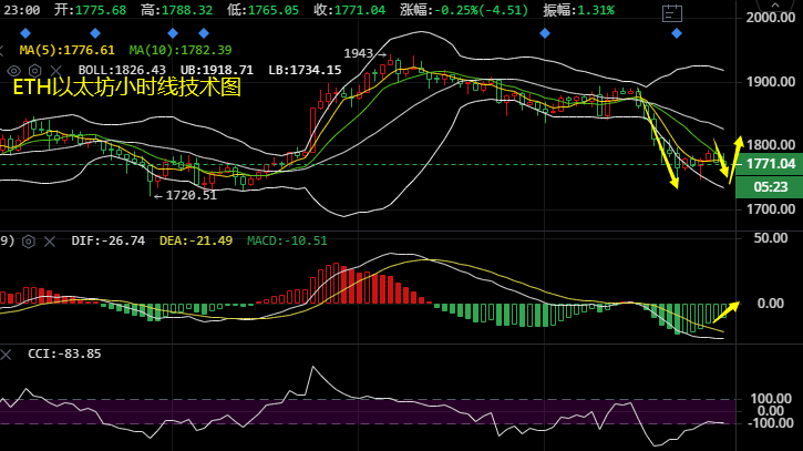 以太坊(ETH):日线以太坊连续收阴直接回吐了周六的大涨势头并连续跌破两大均线支撑,目前币价处于1775美元一带调整。BOLL呈开口状态,整体仍处于上行通道之中调整。短期内重点关注MA5于1830美元一带阻力,只有当币价有效站稳该位置之上,多头将保持反攻继续上测,而下方则重点关注今日的低位于1735美元一带支撑情况。短周期KDJ技术指标缓和运行,附图MACD上方势能缩量,预计以太坊将保持高位调整。短线来看以太坊暴跌至1735美元一线后呈现反弹的势头,但是整体仍处于高位承压之中,美盘在触及1804美元一带之后继续承压下行,短线来看仍有回调的迹象,下方重点关注1750美元一带支撑情况,所以对于今晚的交易上谈老师建议是高沽低渣,不可盲目追涨杀跌。