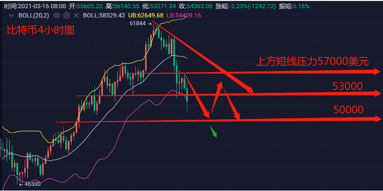比特币从4小时图来看,行情已经跌破55000美元的支撑,这个和昨天预想的一样,只不过昨天虚破一下又反弹了高点反弹57000美元附近,目前趋势已经利空反转趋势,61800美元已经成为近期最高点位,这波下跌预计还会持续,但是就像昨天说的,目前还是不要布局中长线为好,因为行情很有可能来回调波动较大,如果你扛不住风.险,就等不到利润,还是尽量操作短线,看准机会收个一两千点即可那么今天以57000美元作为压力位,下方第一支撑53000—52500美元,跌破52000美元,就要看向50000美元附近,当然,期间也可能伴随着不断的反弹,这个时候如果参考支撑位做多单的话就要注意小利润出局即可,切勿追多适得其反。