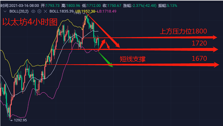 以太坊今天先看下方1720美元附近支撑,下方破位将看向1670美元一线,上方参考1800美元附近的压力位去布局空单。