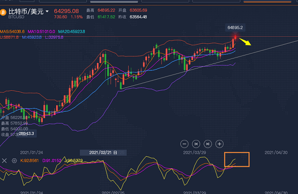 从技术面来看,昨天突破61800阻力后,一路高涨,但显然,今天多头上涨的力度并未得到延续,上午冲高后,回调了2000点,多头上涨空间有限,或明后两日就会再次回撤跌回区间,届时可以布局3000-5000点的中线单子,晚间短线操作的话,上方关注64800-65000阻力,下方关注62800支撑,支撑阻力高空低多操作。