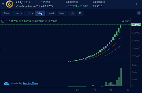 9月24日,距离CFT上线过去29天,CFT表现强势,由0.01575美元的开盘价一路涨至0.2501美元,涨幅达1488%,当日报价0.2501美元。