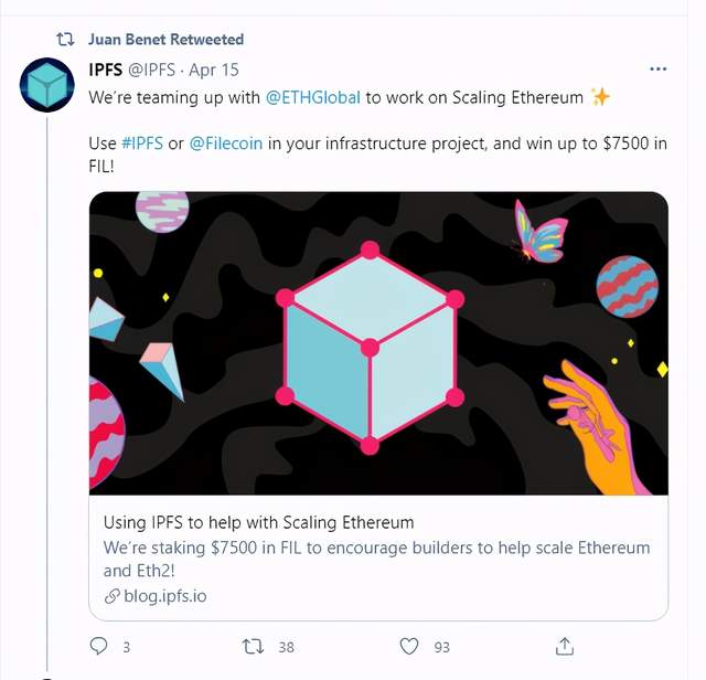 四月十五日, IPFS官方发布消息,称与 ETHGlobal团队合作,将以太坊扩展,在你创建的项目中使用 IPFS或 Filecoin技术,将有机会获得价值7500美元的 FIL。