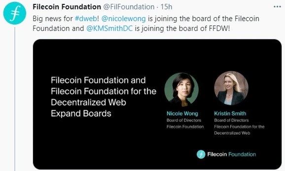 四月二十一日, Filecoin Foundation官方 Twitter发布了最新消息,前美国白宫副首席技术官 Nicole Wong已经加入 Filecoin基金会(FF)董事会。Kristin Smith是区块链协会的执行董事,他已经加入了 Filecoin去中心化网络基金会的董事会。