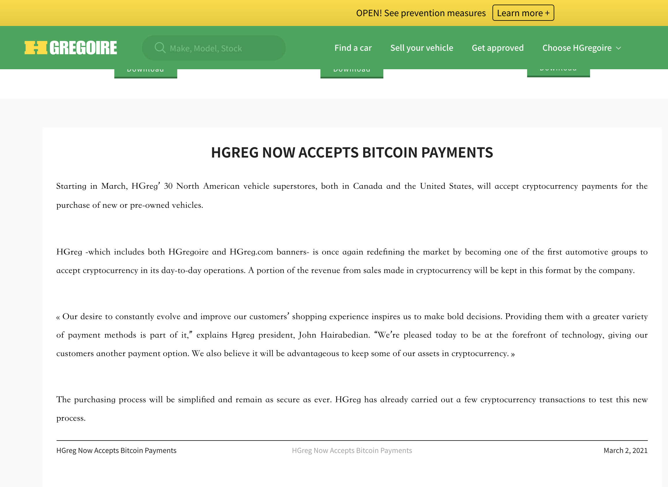 3月2日,二手车经销商HGreg宣布支持比特币支付。从3月开始,HGreg在加拿大和美国的30家商店将接受加密货币付款,用于购买新车和二手车。